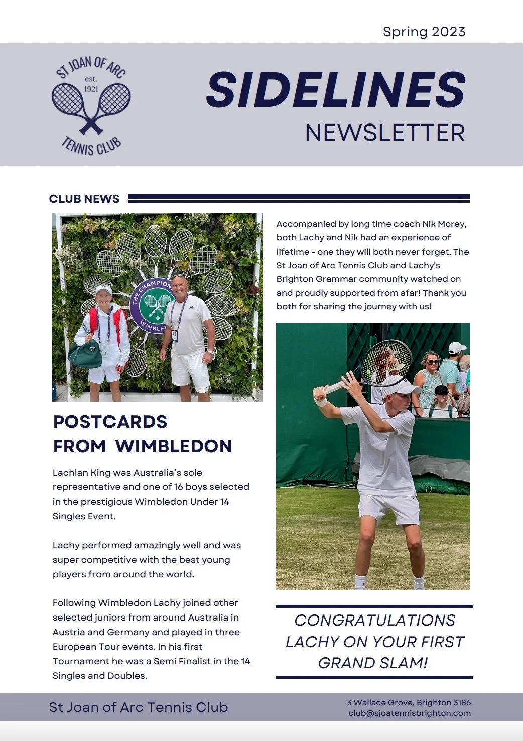 Sidelines Spring 2023 15 Sept Written By SJOA Tennis Brighton Spring Edition Click to read in full Club News from the Sidelines Postcards from WimbledonPremiers & Finalists - Competition wraps up for our Junior Pennant PlayersNew Club PolosLaunching Women’s Weekly Competition SJOA Tennis Brighton